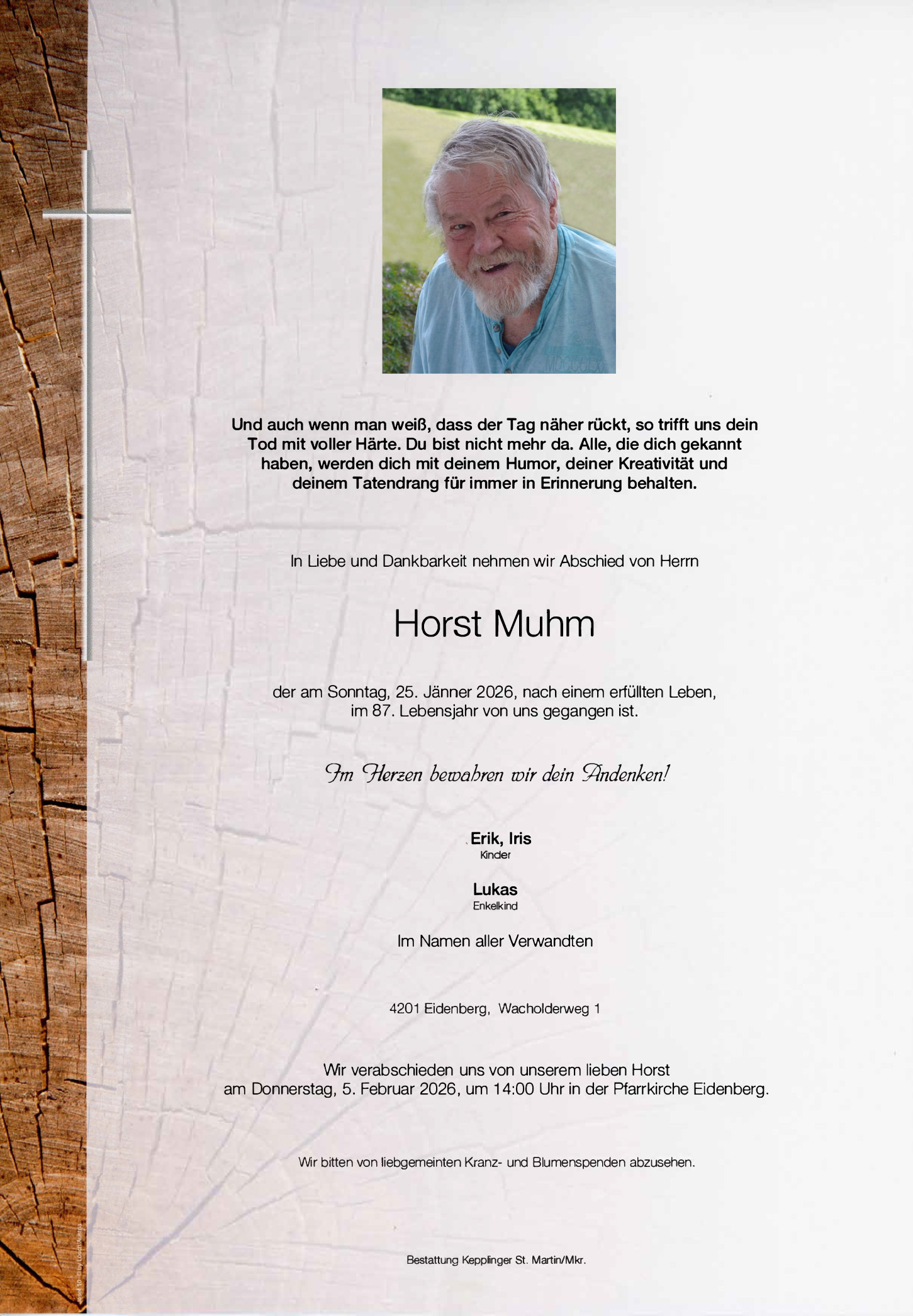 Wir verabschieden uns von Horst am Donnerstag, 5. Februar 2026, um 14:00 Uhr in der Pfarrkirche Eidenberg.