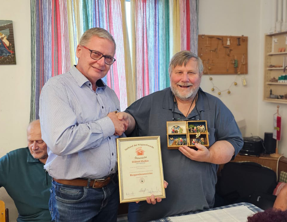 Anfang Mai besuchten Gilbert Mathie den Krippenbaumeister-Lehrgang in der Landeskrippenbauschule Oberösterreich in Geboltskirchen. Gilbert konnte den Krippenbaukurs 4 - dem Krippenbaumeister erfolgreich abschließen.
