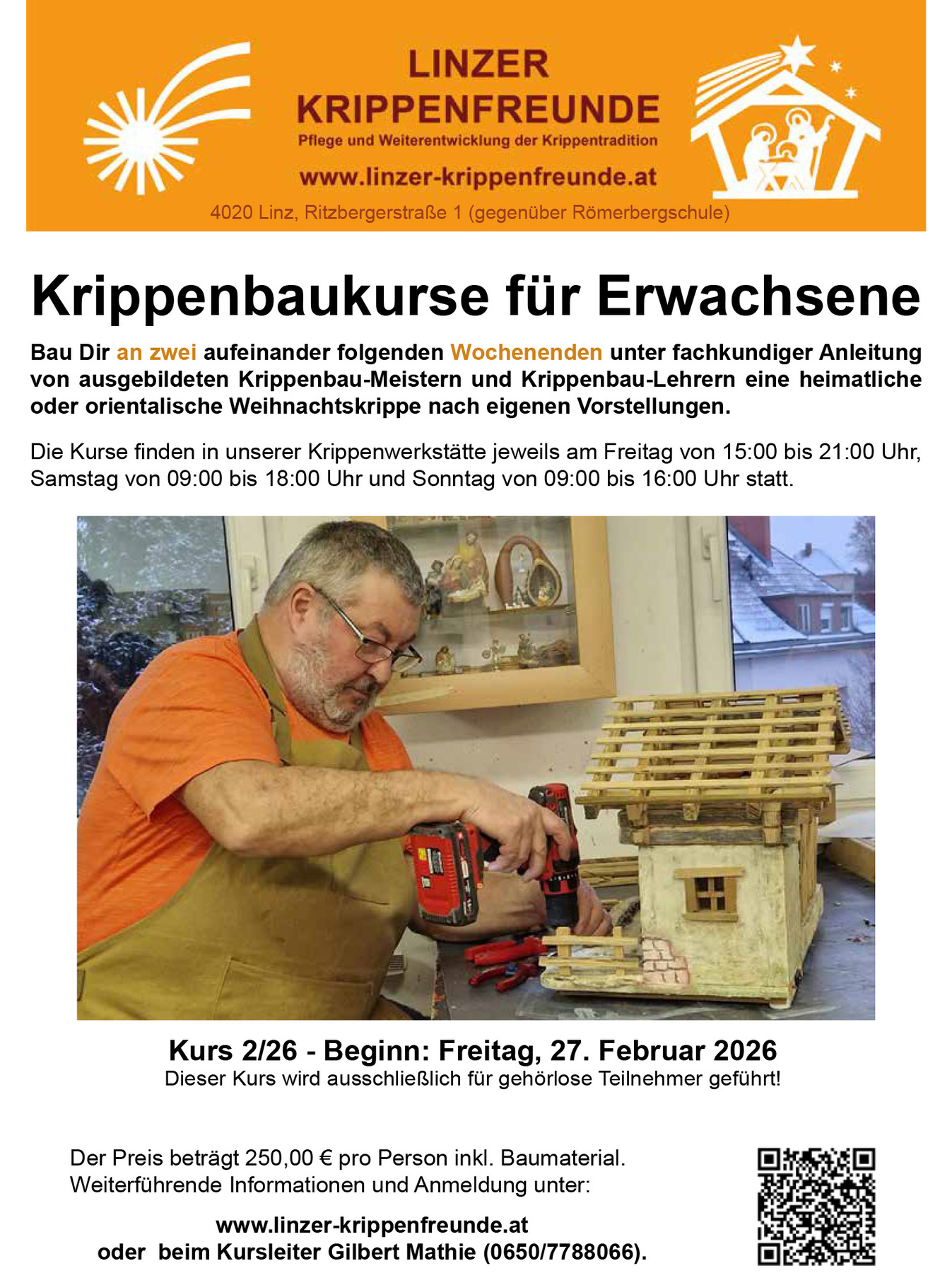 Der Kurse findet in unserer Krippenwerkstätte jeweils am Freitag von 15:00 bis 21:00 Uhr, Samstag von 09:00 bis 18:00 Uhr und Sonntag von 09:00 bis 16:00 Uhr statt.