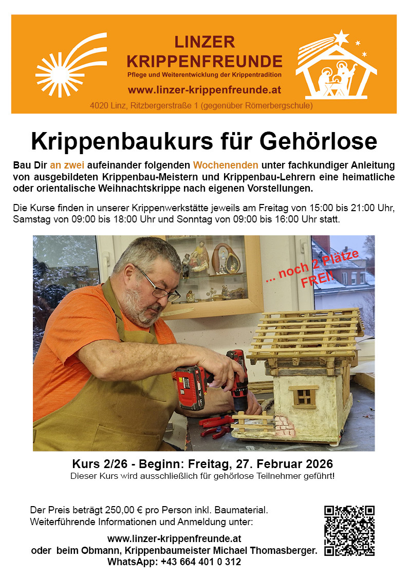 Dieser Krippenbaukurs wird ausschließlich für gehörlose Teilnehmer (Anfänger) geführt! Beginn: Freitag, 27. Februar 2026.