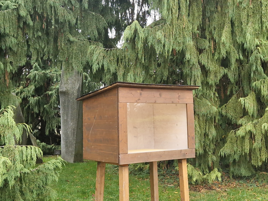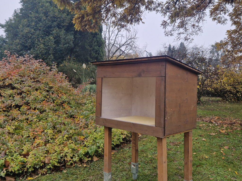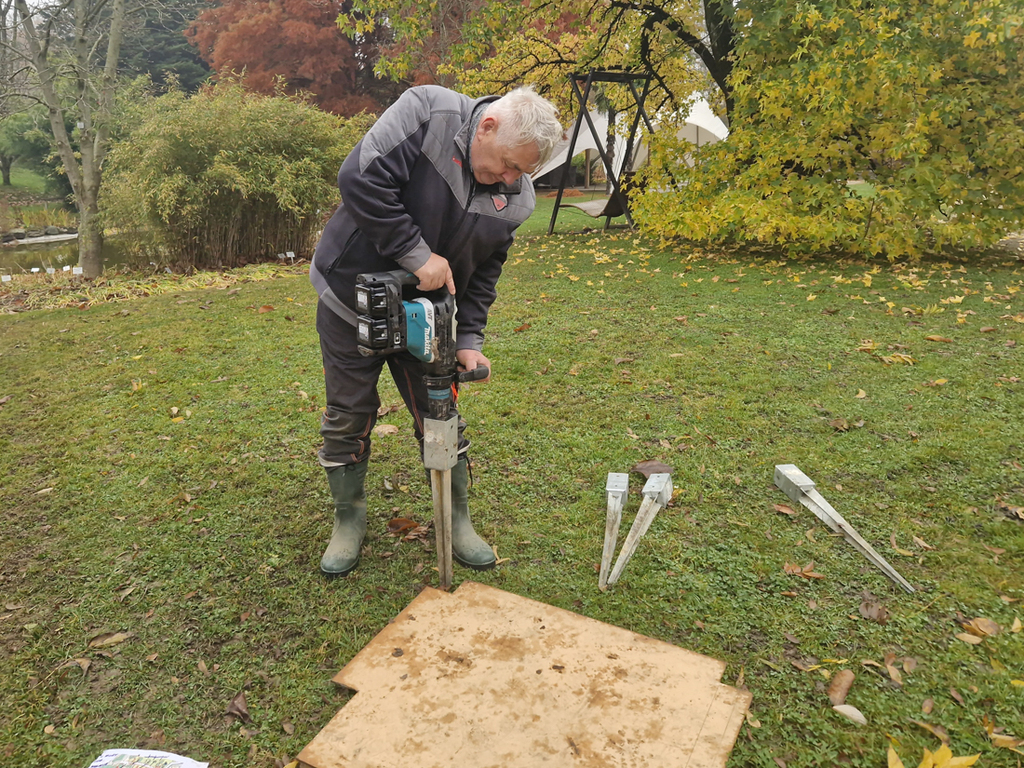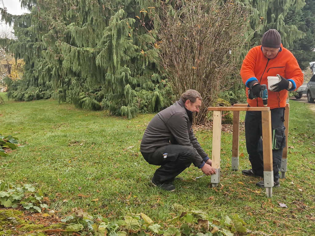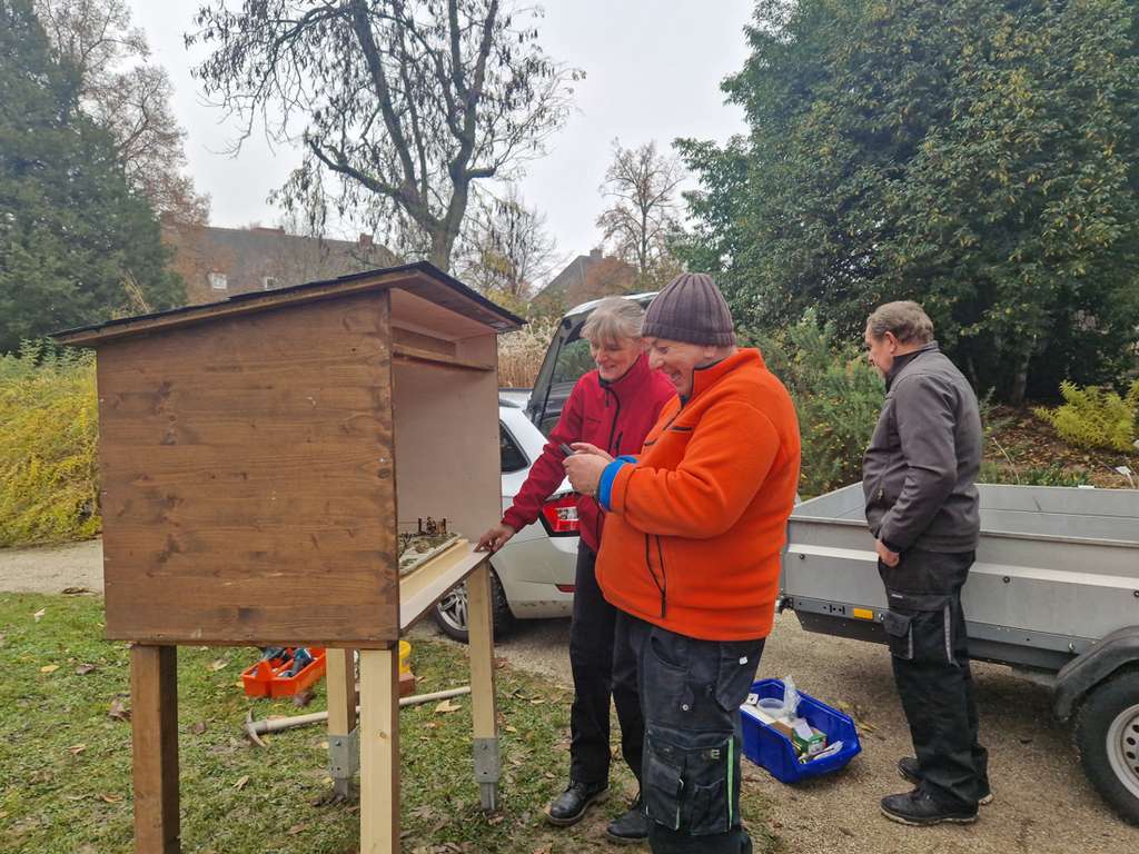 Zwei Wochen vor der Eröffnung der Krippenausstellung im Botanischen Garten rückte ein sechsköpfiges Team an, ausgestattet mit Wasserwaage, Schlagbohrer, Schraubenschlüssel und Schrauben. Die Krippenkästen im Freigelände wurden mit viel Eifer und Energie von Robert, Daniela, Walter, Karl, Michael und Lydia aufgestellt.